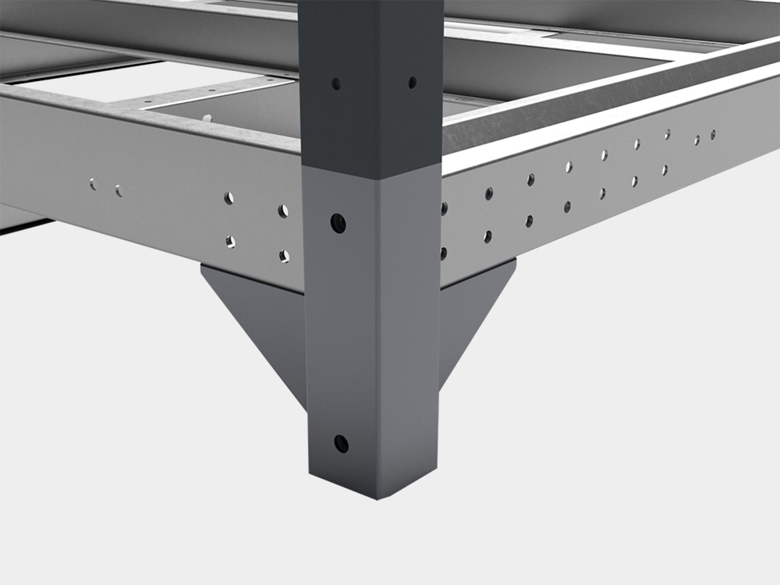 Der Eckwinkel aus Edelstahl ist wesentlich für die gesamte Konstruktion, sorgt für hohe Stabilität und ist der Dreh-, und Angelpunkt für die Längsträger und Stützen. Seine Robustheit sorgt für Langlebigkeit und Zuverlässigkeit.